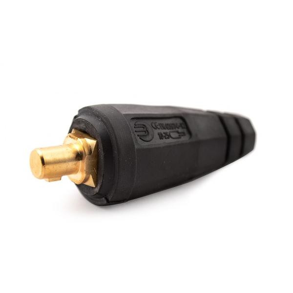 При соединении разъёма и повороте на 90 градусов вправо, происходит контактное токовое соединение. Подключение подачи тока со стороны источника питания, производится с помощью клеммы на гнезде и со стороны штекера – креплением сварочного кабеля соответствующего сечения.